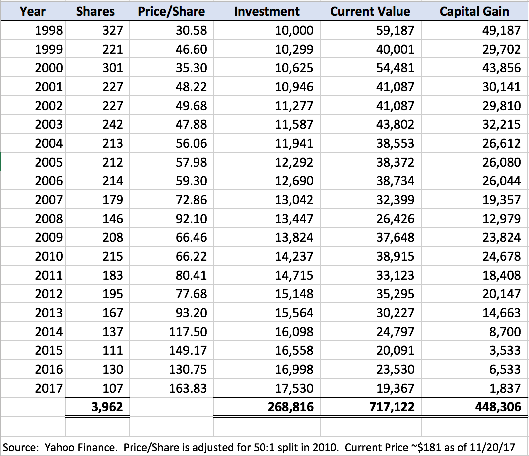 Let’s take a look at a hypothetical example that demonstrates the real life impact of the Senate’s proposal on a small investor. James is a 65 year old pharmacist who plans to retire on January 1, 2018. Over the past twenty years, James has invested in Berkshire Hathaway B shares on the first trading day of each year. He started in 1998 with a $10,000 investment that purchased 327 Berkshire Hathaway B shares (split adjusted – assume for this example that purchasing fractional pre-split shares would have been possible). Every year, he increased his investment by approximately 3 percent which roughly mirrored increases in his paycheck. Today he owns 3,962 shares of Berkshire Class B worth slightly more than $717,000. Of this amount, over $448,000 represents capital gains. The exhibit below illustrates the annual purchases and the capital gain attributed to each purchase: