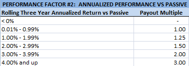 The table indicates that any underperformance will result in no payout at all, regardless of absolute performance. As an example, if the portfolio returned 15 percent annualized on a three year rolling basis, that would indicate an additional incentive payout of 0.5 percent based on Performance Factor #1. However, if the passive strategy provided a return greater than 15 percent annualized, there would be no additional payout because the payout multiple would be zero. On the other hand, if the portfolio outperformed the passive strategy by over 4 percent, the payout multiple would be 3 and the incentive payout would be 1.5 percent (0.5% x 3).